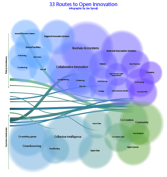 The infographic includes 33 routes to Open Innovation, ordened by: